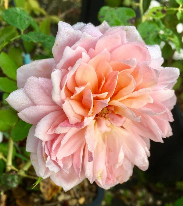 Bassa ed espansa, con portamento “a fontana”, ha foglie verde chiaro e fiori a coppa di un rosa pastello più scuro verso il centro, con i petali disposti in rosette simmetriche e un abbozzo di occhio centrale.