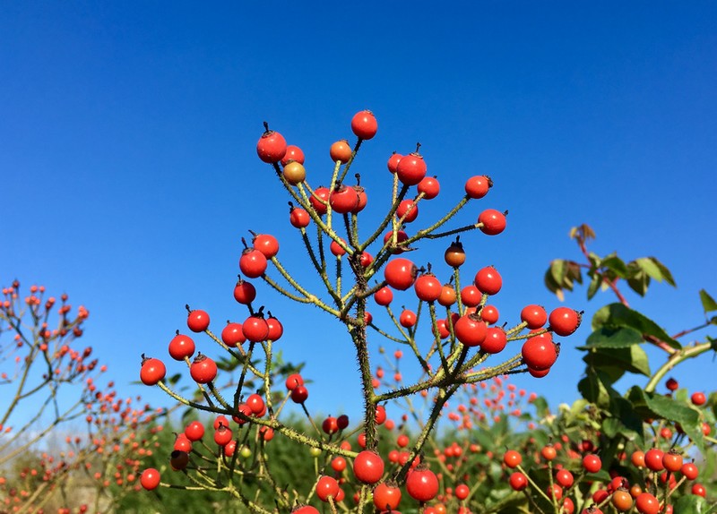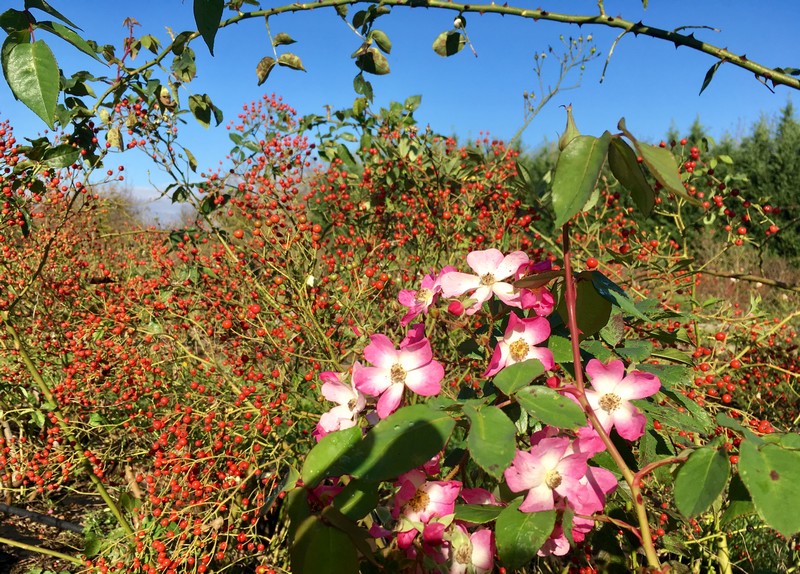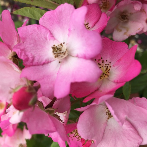 “Ballerina” produce senza interruzione grandi corimbi di fiori semplici, dai petali cuoriformi rosa scuro con occhio bianco che sbiadiscono quasi completamente e generano piccoli cinorrodi arancioni, decorativi per tutto l’inverno.