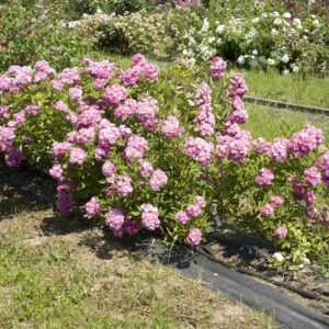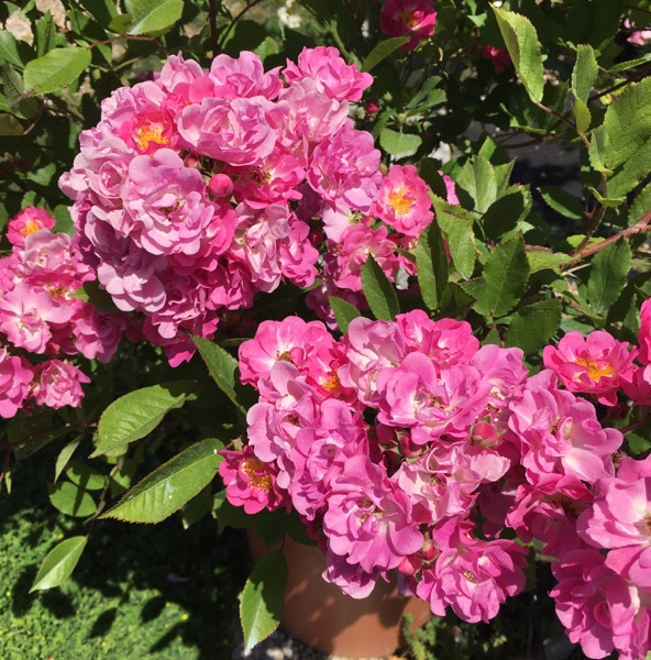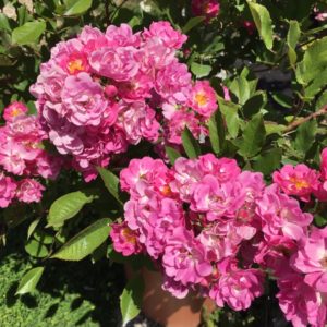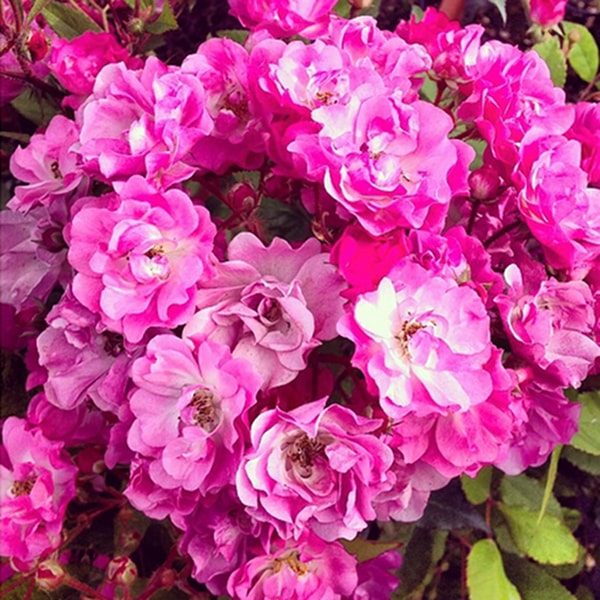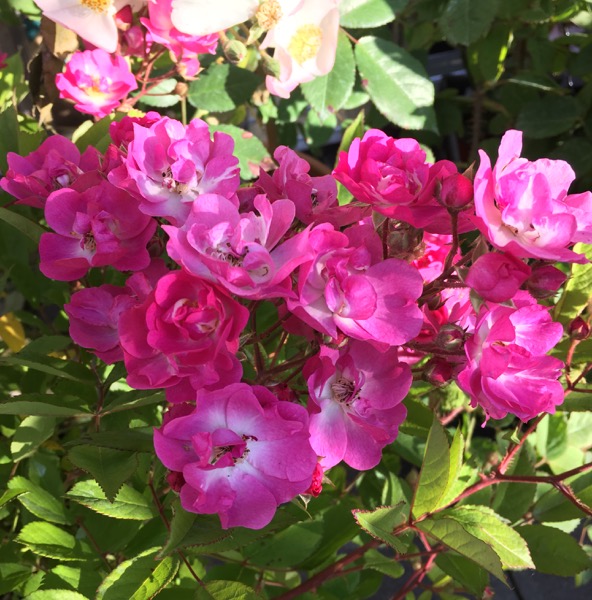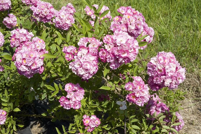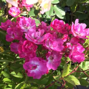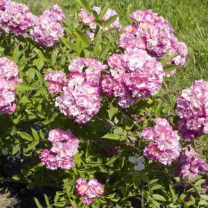 I fiori hanno più petali e sono di un rosa più intenso, che sbiadisce verso il tenue ma si mantiene bene se coltivata in mezzombra. Le piccole rose sbocciano in grandissimi mazzi spumosi, all’apice di lunghi steli arcuati, che poi si riempono di piccole bacche.
