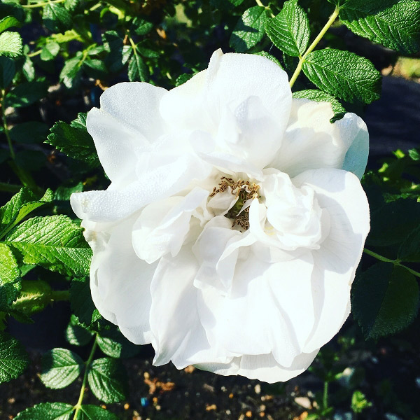Le grandi foglie solcate di rughe, che in autunno diventano giallo oro, fanno da cornice alla fioritura continua di ampie corolle bianche che si sciupano un po’ con la pioggia ma profumatissime, e seguite da tozzi cinorrodi arancio.