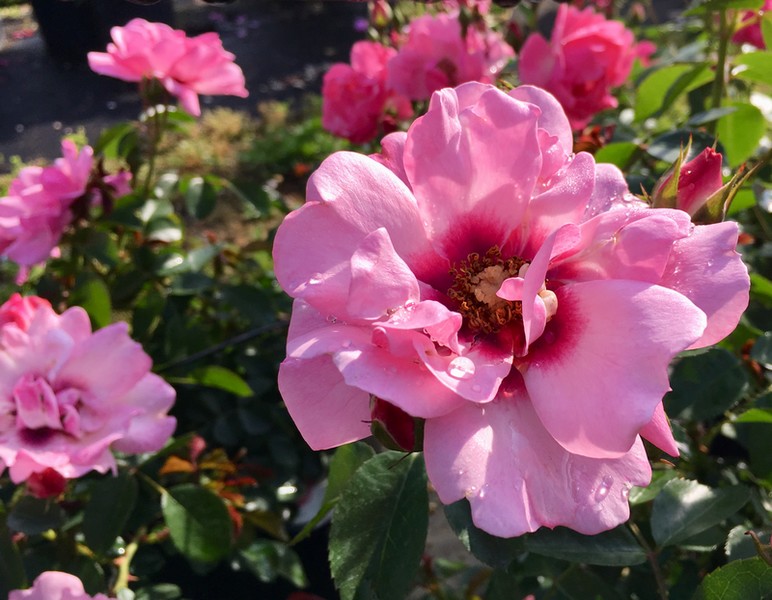 Rifiorisce con continuità e producendo fiori abbastanza doppi, dai petali rosa chiaro con una definita macchia cremisi alla base che crea un evidente cerchio amaranto centrale. I corposi cinorrodi rossi e tondi che seguono la fioritura restano estremamente decorativi per tutto l’inverno.