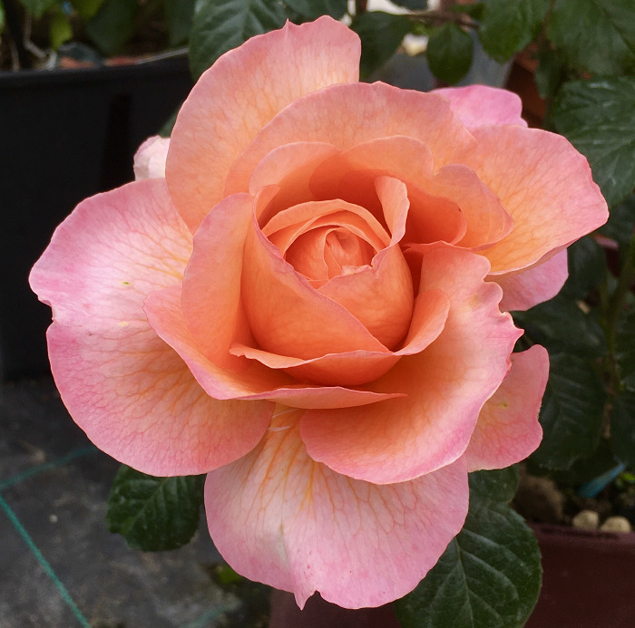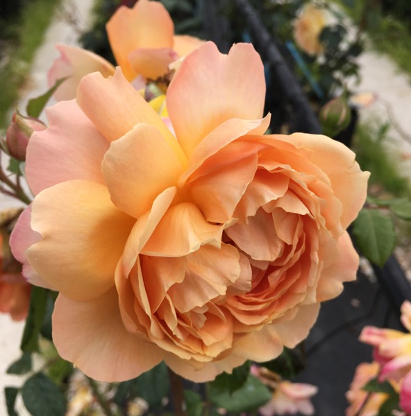 Il fogliame è coriaceo e scuro, i nuovi rami sono bronzei e i fiori formano corpose coppe un poco arruffate, albicocca ramato, estremamente profumate.