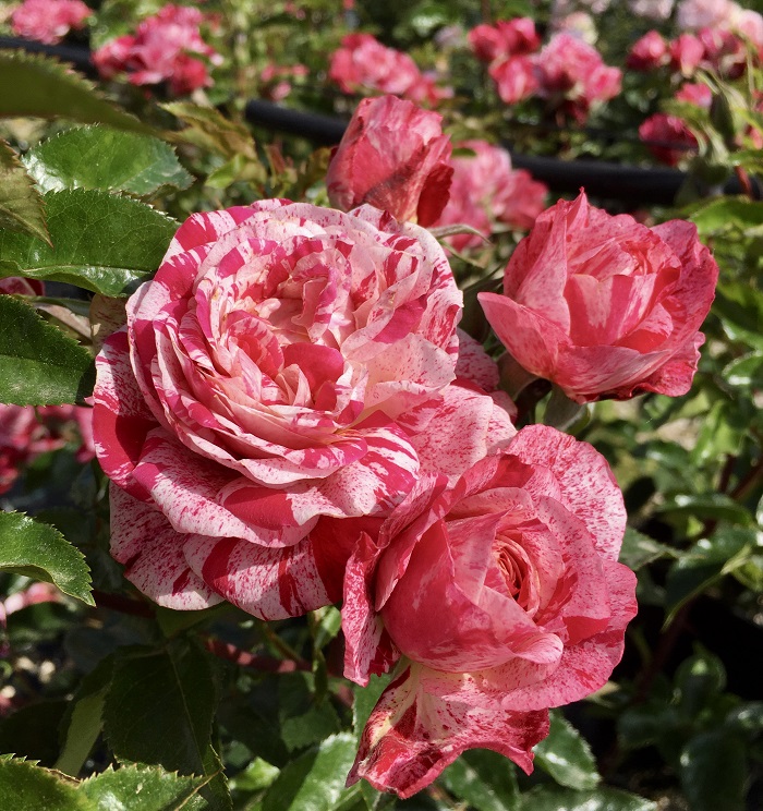 Gli splendidi fiori doppi sono di un brillante rosa ciliegia con striature crema che prendono, col tempo e la luce, a loro volta sfumature rosa.