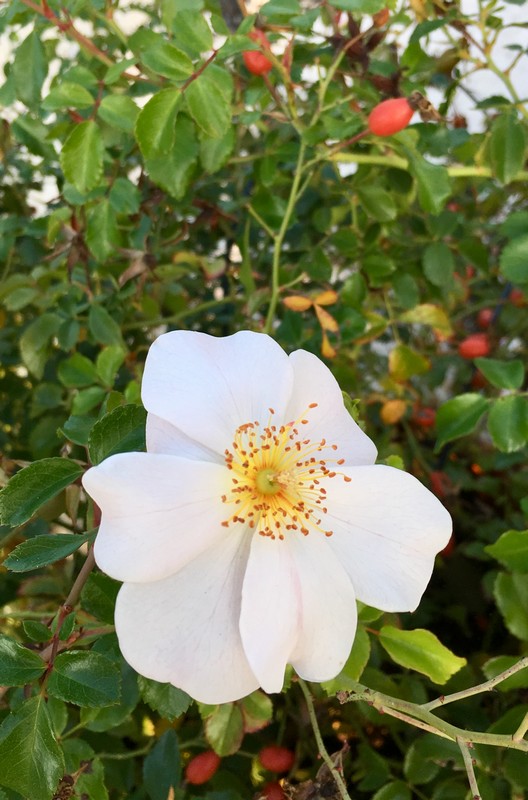 I boccioli sono rosati ed appuntiti, le foglie piuttosto piccole, scure e sanissime; ha un delicato profumo e da fine estate iniziano a vedersi grappoli di cinorrodi ovoidali che si accompagnano alle rose, presenti sino ai geli.