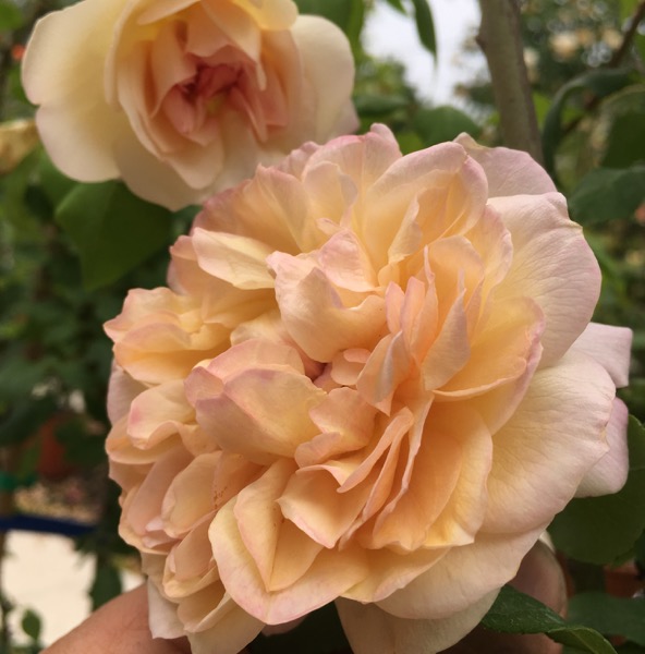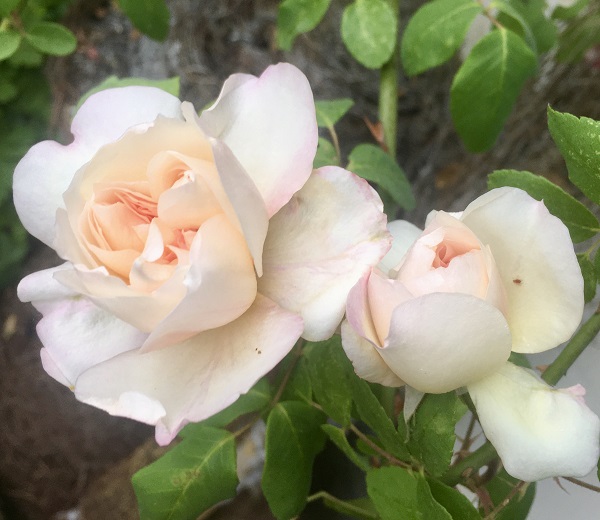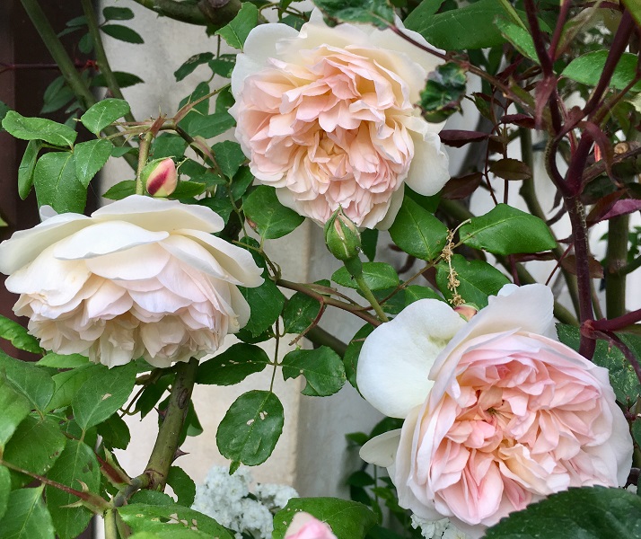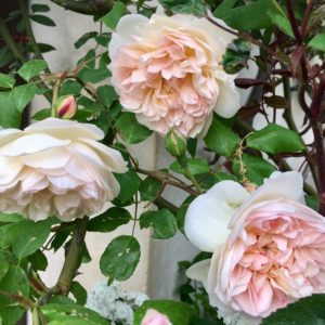 Le rosette che sbocciano in piccoli grappoli sono di un colore sempre mutevole tra il crema chiarissimo ed il rosa altrettanto tenue, con un accennato bottone centrale.