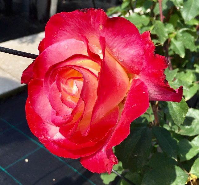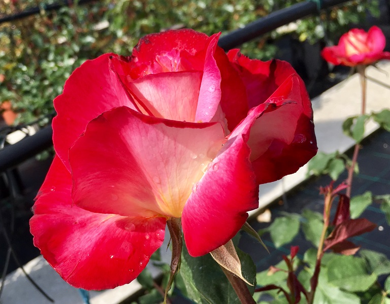 Il colore centrale è bianco avorio mentre il bordo dei petali più esterni è rosso ribes…man mano che il fiore invecchia, il sole ne muta il colore così che un rosso sbiadito si espande fino ai petali più interni e l’impressione generale è quella di un diffuso rosa ciliegia.