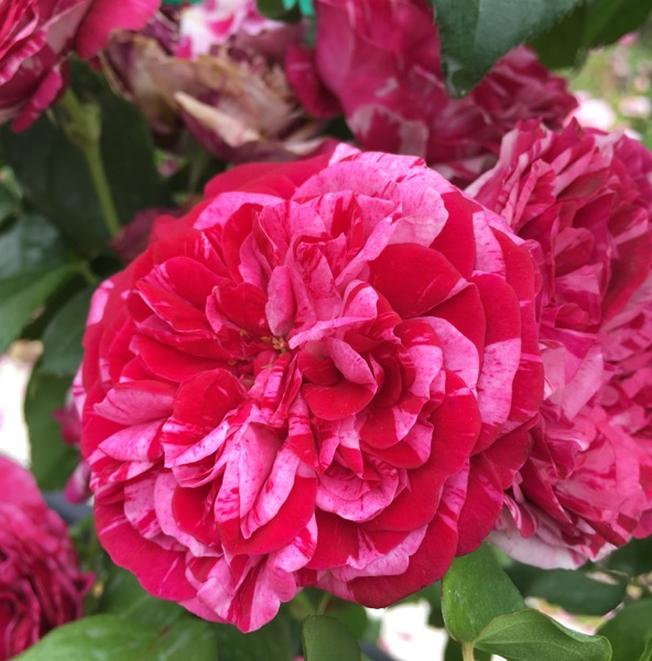 I rami dalle spine rade sono lisci e inizialmente bruniti, e portano densi mazzetti di piccole coppe con fitti petali disposti a rosetta, striati nelle varie tonalità del rosa, dal cremisi al malva.