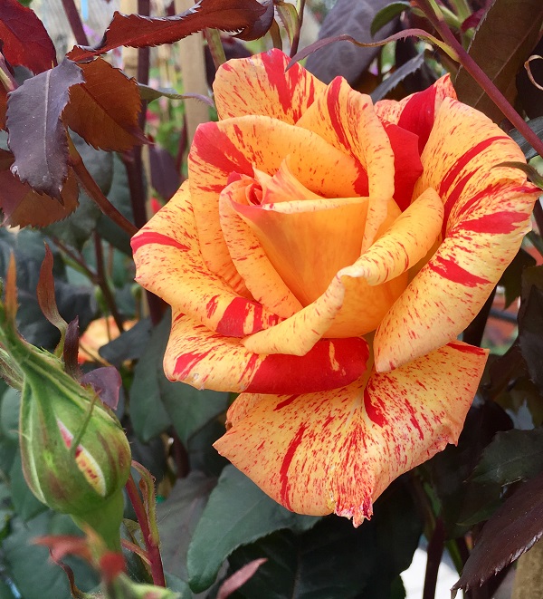 I grandi fiori, leggermente profumati, sbocciano per lo più solitari in cima ai rami robusti, da boccioli allungati in cui già si intuiscono le striature gialle e rosse che infiammano la rosa aperta.
