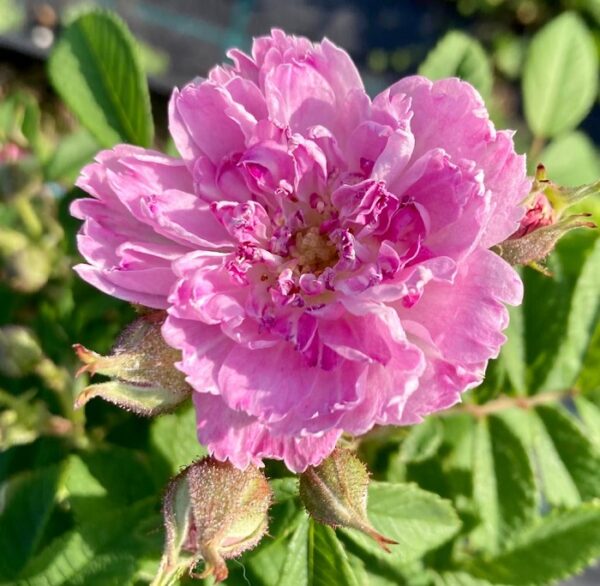 Lo stesso per i fiori, che sbocciano in piccoli mazzi di fiorellini dai petali serrati come quelli dei garofani, molto simili a quelli della rosa Fimbriata, se non più doppi e di un evanescente rosa-lilla chiarissimo.