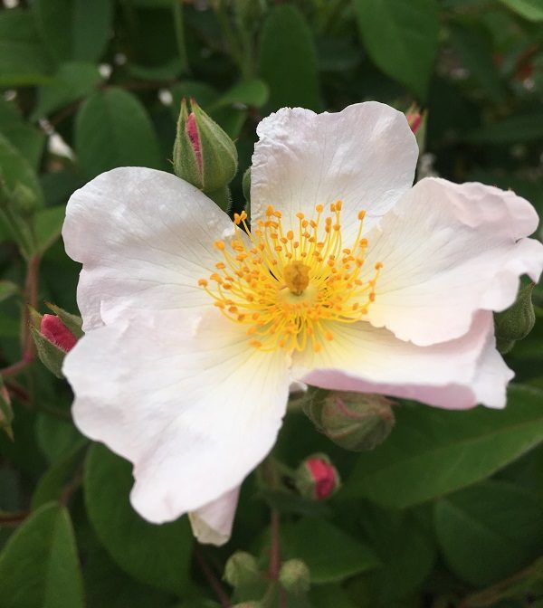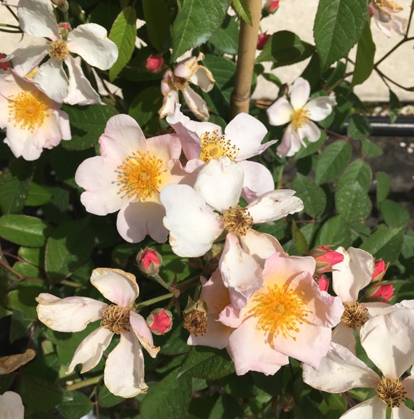 “Kathleen” è facilmente riconoscibile tra gli ibridi di Moschata per la sua parvenza “selvatica” e la forma particolare dei petali.