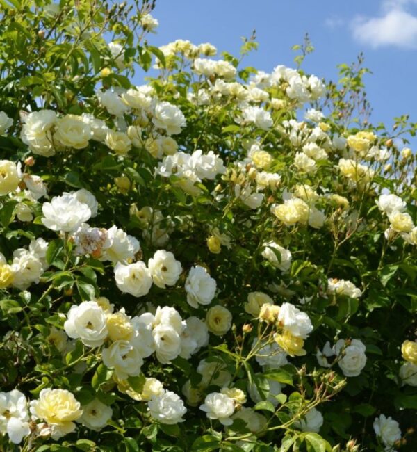 Una rosa rampicante forte, rifiorente, con steli morbidi, bei grappoli di piccoli fiori a coppa, giallo limone fluorescente.
