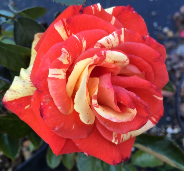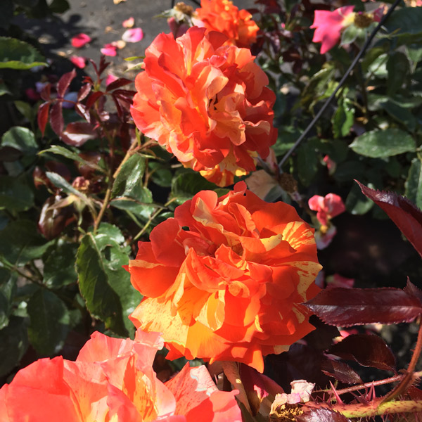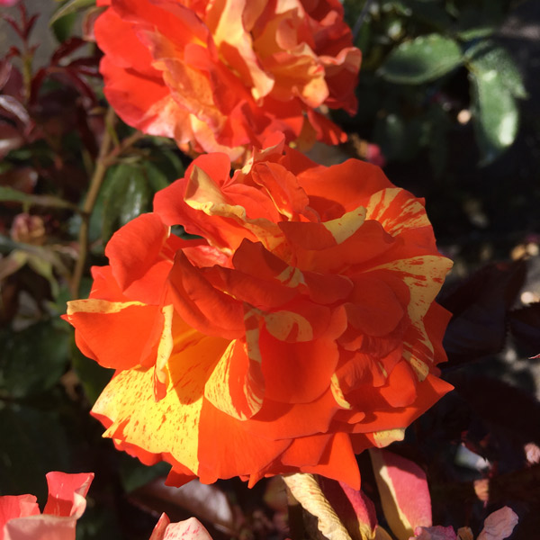 Striature inusuali, giallo e arancio che virano al rosa, in fiori ampi, mossi, con profumo fruttato – il cespuglio e’ alto, lasso, quasi inerme, con fogliame lucido; teme lievemente il freddo.