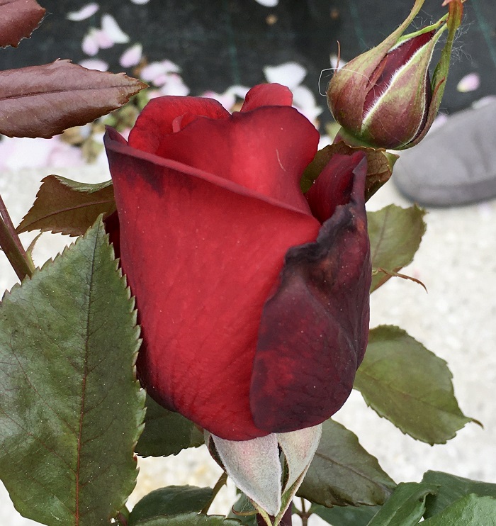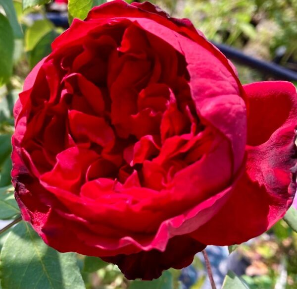 Le grandi coppe si aprono da boccioli scurissimi in masse stradoppie di petali vellutati rosso rubino, che nelle zone marginali tendono ad annerire al sole. Generosa nella fioritura, ha anche il pregio di mantenere a lungo il fiore grazie alla sua “petalosità”.