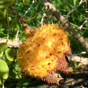 Anche le bacche gialle sono particolarissime, grandi, tozze e spinose.