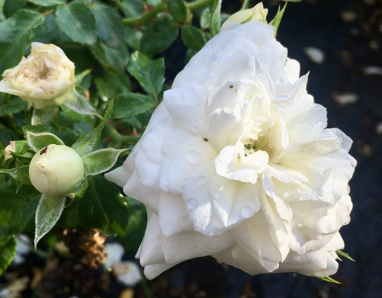 I piccoli e graziosi fiori doppi sono talvolta divisi in quarti, bianco traslucido, con leggero profumo di violetta, e sbocciano per tutta la stagione.