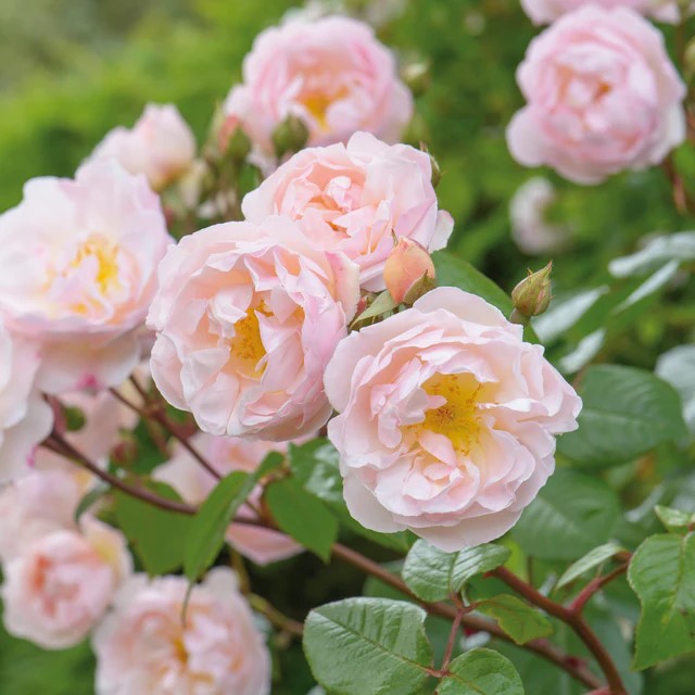 L’aspetto ricorda certe vecchie Noisette dalle foglie chiare e allungate, sorrette da giovani rami rossastri con rade spine e grappoli di fiori romantici e leggeri.