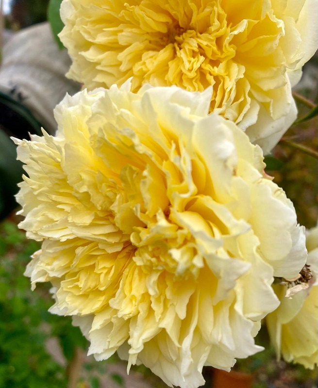 Robusta e rifiorente, ha grandi foglie verde scuro che contrastano col bel giallo delle ampie rosette stradoppie, che sfumano verso toni più chiari nei petali esterni.